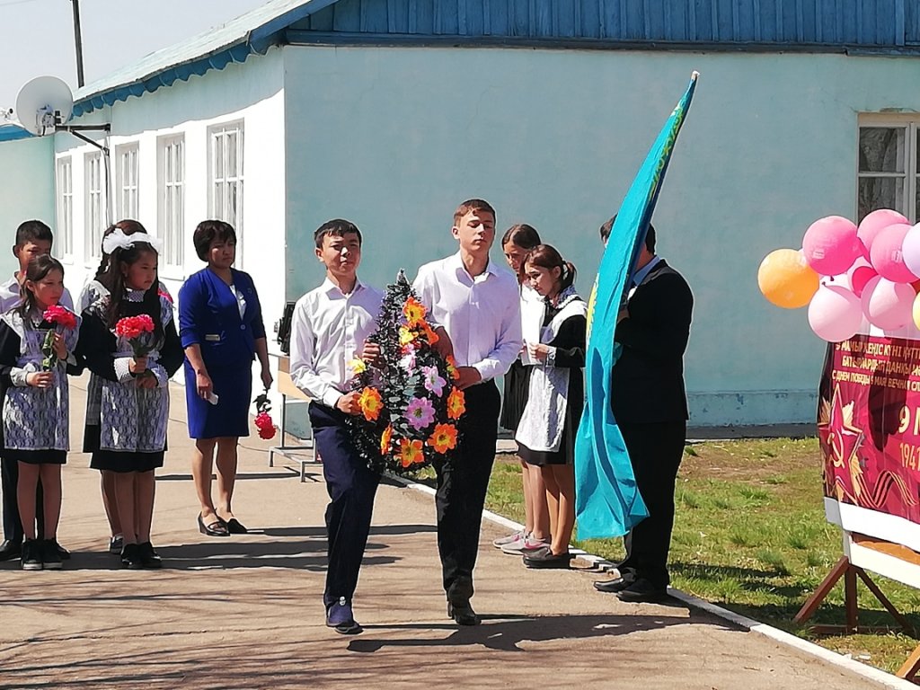 Мектеп алдындағы ескерткішке гул шоқтарын қойып, ардагерлерге тағзым етті.