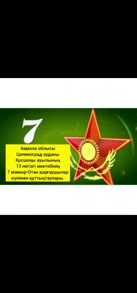 Мектебімізде 7 мамыр-Отан қорғаушылар күніне орай қашықтықтан іс-шаралар өткізілді. Оқушыларға Ұлы Отанды сүюге, ерлік көрсеткен батырлардың бойындағы ержүректілік, отан сүйгіштік, ұлтжандылық қасиеттерін дәріптеу. Отанын ,елін қорғай білу насихатталды. Оқушылар үй жағдайында мерекеге сай тақпақтар оқып,өлеңдер айтып, би биледі. Аталған іс –шаралар әлеуметтік желілерге жүктелді.